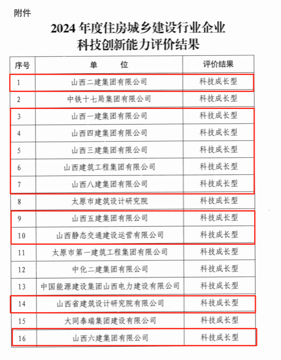 近日,山西省住房和城鄉(xiāng)建設(shè)廳發(fā)布了2024年度住房和城鄉(xiāng)建設(shè)行業(yè)企業(yè)科技創(chuàng)新能力評(píng)價(jià)結(jié)果。省內(nèi)共21家行業(yè)企業(yè)入選,其中山西建投旗下15家企業(yè)獲評(píng)科技成長(zhǎng)型企業(yè)。
