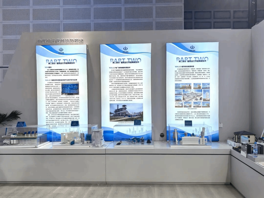 建筑運(yùn)行節(jié)能降碳技術(shù)展區(qū),展現(xiàn)了地源熱泵系統(tǒng)、多臺(tái)純凝發(fā)電機(jī)組聯(lián)合供熱等清潔供熱技術(shù)。