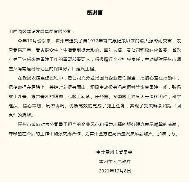 臨近除夕,一度受災(zāi)破敗的村莊展現(xiàn)出全新的容貌,一度愁容滿面的村民們臉上又展現(xiàn)出甜蜜的笑容。在馮南垣村東口的照壁上,“共建美麗鄉(xiāng)村共享美好生活”十二個大字在太陽的照耀下格外醒目,這是對此次災(zāi)后恢復(fù)重建工作的生動詮釋,也反映出廣大村民和參與恢復(fù)重建全體人員對未來生活的信心決心。與此同時,山西建投也收到了霍州市人民政府一封“沉甸甸”的感謝信。