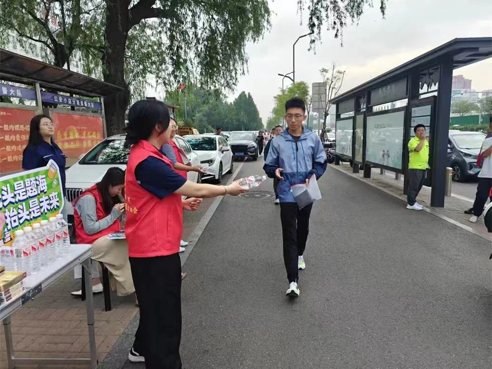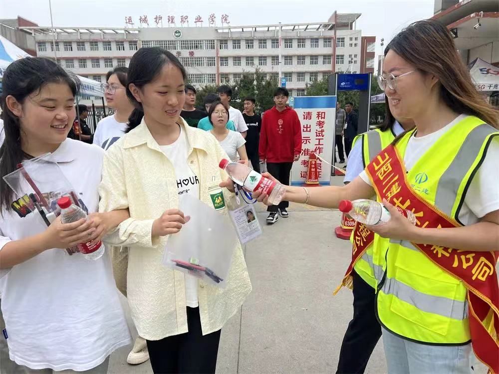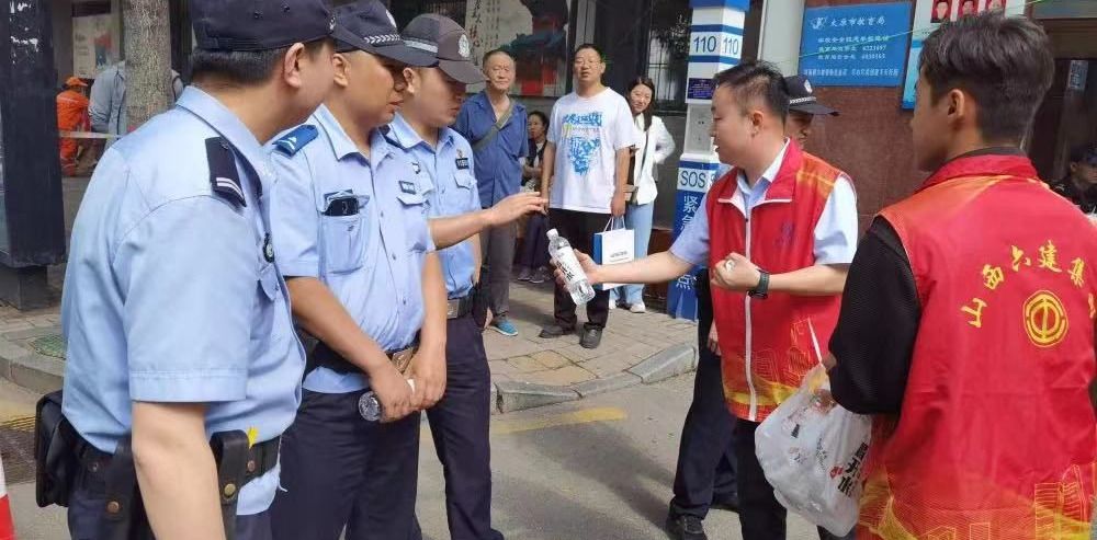 為守護(hù)在考場(chǎng)外的公安、交警等工作人員送上飲水,并全力協(xié)助交警在街頭巷尾維持交通秩序,確??忌軌虬踩?、快捷、順利抵達(dá)考場(chǎng)。