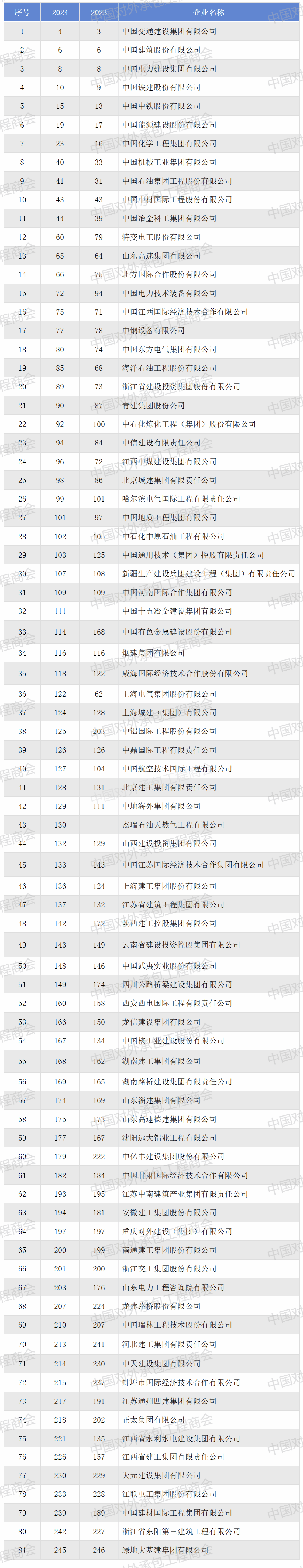2024年度ENR“全球最大250家國際承包商”上榜中國企業(yè)名單