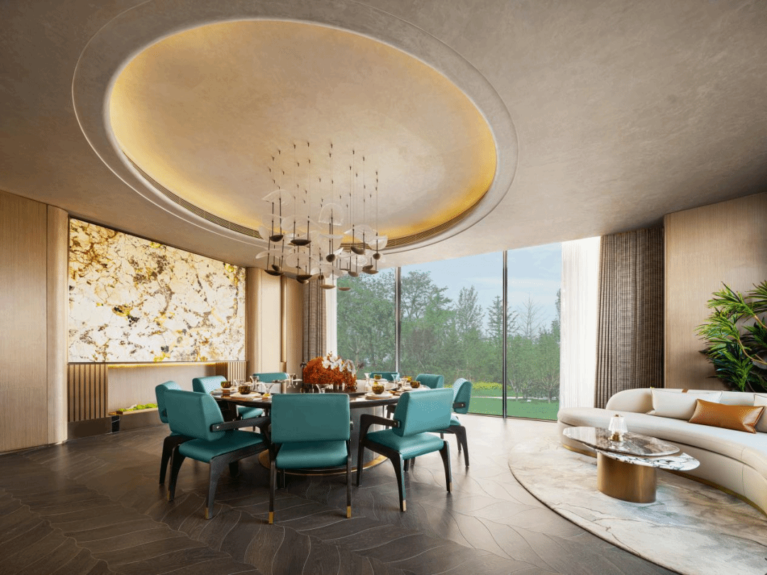 行舟|洽談區(qū)以汾河為背景,以船為引,強調(diào)流動感與優(yōu)雅;天花板的曲線造型如水波蕩漾,與地面柔和的波紋地毯形成呼應,整體造型自然流暢。