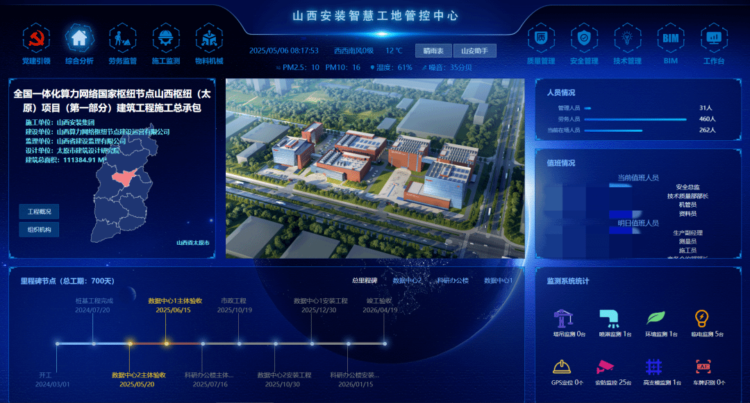 走進(jìn)施工現(xiàn)場(chǎng),智慧工地的科技?xì)庀涿娑鴣?lái)。項(xiàng)目深度融合數(shù)字技術(shù)與工程管理,應(yīng)用智慧工地管控平臺(tái),讓工程建設(shè)更加安全高效。
