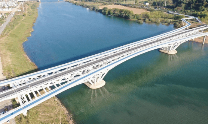 云碧峰大橋作為國內(nèi)首座掌托型連續(xù)鋼桁架剛構(gòu)橋,集主橋車輛通行與輔橋行人、非機動車通行功能于一體。工程涵蓋道路、橋梁、排水及景觀、交通標志標線等附屬設(shè)施,總投資2.32億元。其中主橋長714米、寬8米,最大跨度120米;東西輔橋分別長643米、827米,各寬4.5米。大橋橫跨上饒市信江,位于云碧峰公園北側(cè),是信江濕地公園核心出入口及連通云碧峰與濕地公園的標志性工程。作為上饒市“加環(huán)路”交通體系的關(guān)鍵節(jié)點,項目不僅完善了區(qū)域內(nèi)外交通路網(wǎng)骨架,更優(yōu)化了云碧峰森林公園生態(tài)休閑區(qū)交通布局,有效緩解城市擁堵,提升功能品質(zhì),為“大美上饒”建設(shè)與城市可持續(xù)發(fā)展注入強勁動能。