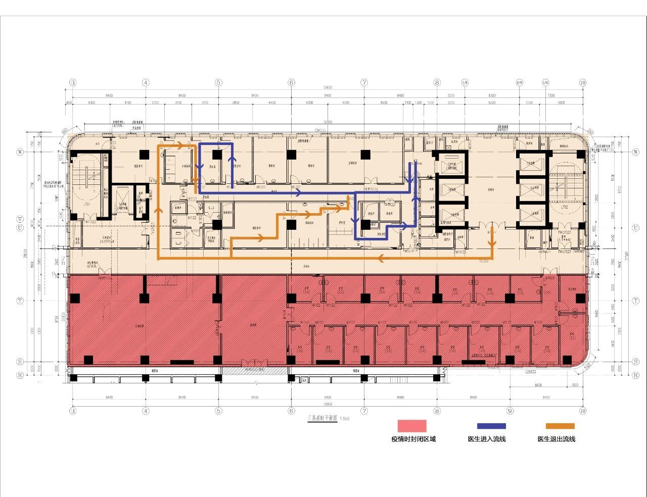 在局促狹窄的空間內(nèi),傳統(tǒng)的平面轉(zhuǎn)換模式效率低下、成本高昂。于是,團隊首創(chuàng)性地提出并實踐了“垂直集中轉(zhuǎn)換”策略,實現(xiàn)了空間與效率的雙贏。該策略的核心在于縱向集成轉(zhuǎn)換功能:在疫病基地三層設(shè)置集中衛(wèi)生通過區(qū),作為醫(yī)護人員進出污染病房層的唯一固定節(jié)點,取代了傳統(tǒng)各層分散設(shè)置的冗余模式,顯著節(jié)省了寶貴的平面空間。醫(yī)護人員經(jīng)此區(qū)完成防護穿戴后,通過專用密閉電梯垂直直達目標病房層;診療結(jié)束后,經(jīng)由特定路線(使用病患電梯)返回該區(qū)脫卸防護。這種垂直專用流線設(shè)計,不僅嚴格保證了清潔區(qū)、半污染區(qū)、污染區(qū)的人員物理分離,還節(jié)省了改造功能的面積,確保日常醫(yī)療功能的高效運行。
