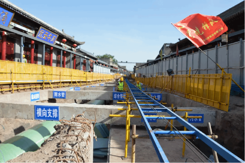 平遙古城是世界文化遺產(chǎn),項(xiàng)目團(tuán)隊(duì)秉持對(duì)文化遺產(chǎn)保護(hù)的高度自覺,前期對(duì)古城4條大街、121條小街巷、6600多戶居民、19處國家級(jí)文物保護(hù)單位及101處省縣級(jí)文物保護(hù)單位等進(jìn)行詳細(xì)摸底,并精準(zhǔn)校對(duì)20世紀(jì)70年代古城地形圖。在施工過程中,采用分區(qū)分段、多點(diǎn)錯(cuò)峰的施工策略,將工程劃分為4個(gè)片區(qū)穩(wěn)步推進(jìn),通過設(shè)置臨時(shí)橋架,改遷水、電、網(wǎng)絡(luò)線路,邀請(qǐng)專家勘察監(jiān)測(cè)、優(yōu)化施工方案,為每條街巷重塑“地下經(jīng)絡(luò)”。