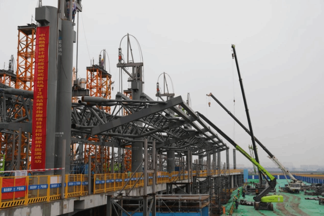 太原武宿國際機場T3航站樓東指廊項目屋蓋桁架首段提升圓滿成功