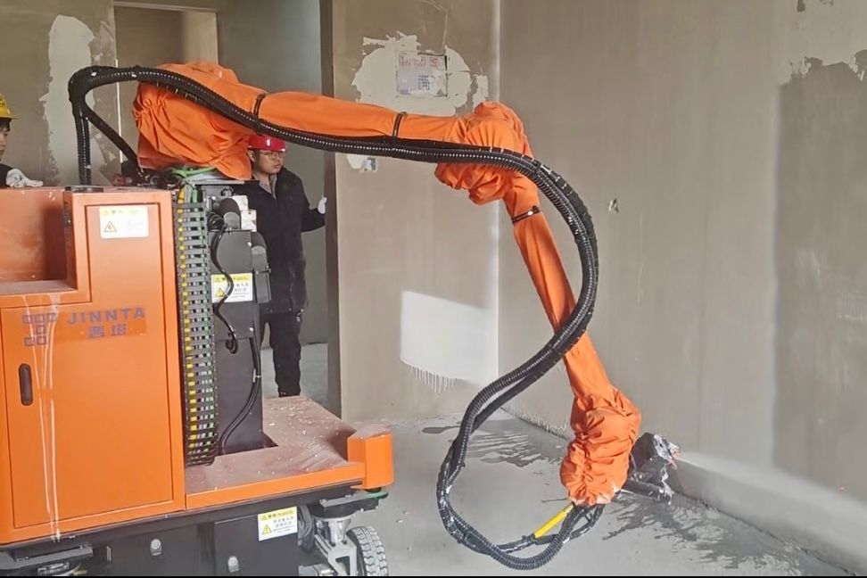 在山西師范大學(xué)南校區(qū)建設(shè)項(xiàng)目,晉塔智能機(jī)器人表現(xiàn)優(yōu)異。噴刮打磨一體機(jī)器人憑借視覺導(dǎo)航技術(shù)精準(zhǔn)定位作業(yè)區(qū)域,機(jī)械臂靈活運(yùn)轉(zhuǎn),墻角、陰陽角等復(fù)雜部位一次成型,施工作業(yè)幾乎不產(chǎn)生粉塵,讓施工環(huán)境更綠色環(huán)保。該設(shè)備30分鐘即可完成100m2的作業(yè)量,施工效率是人工輥涂、打磨的5倍以上,姿態(tài)誤差±1°,定位精度±5 cm。在人機(jī)施工效果對比宿舍展區(qū),機(jī)器人作業(yè)墻面與傳統(tǒng)施工作業(yè)墻面對比鮮明,其作業(yè)均勻度遠(yuǎn)超人工操作,現(xiàn)場觀摩人員直觀感受到“機(jī)械化換人、自動(dòng)化減人”的顯著優(yōu)勢。