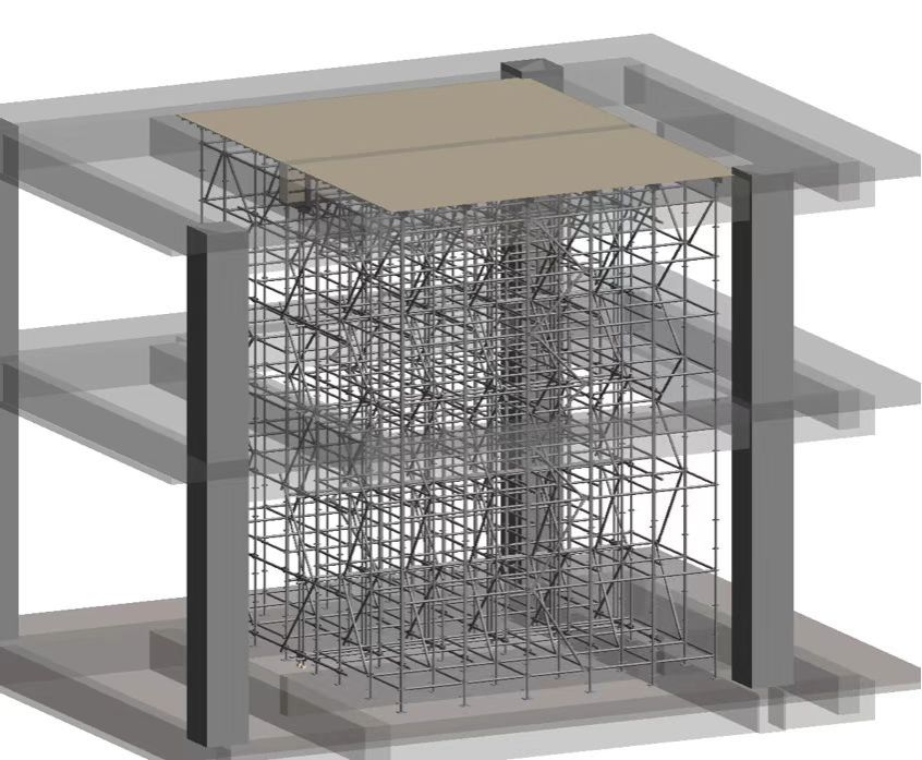 項目主體結構施工面臨多項超危工程挑戰(zhàn):結構挑檐外挑4米、搭設高度19.8米,形成超高超重支模體系;中空大廳支模高度11米,穩(wěn)定性控制要求嚴苛;會議室大截面梁施工超出常規(guī)限值。同時,裝配式樓承板施工存在“拼裝慢、平整度差”的問題,嚴重影響工期與質量。