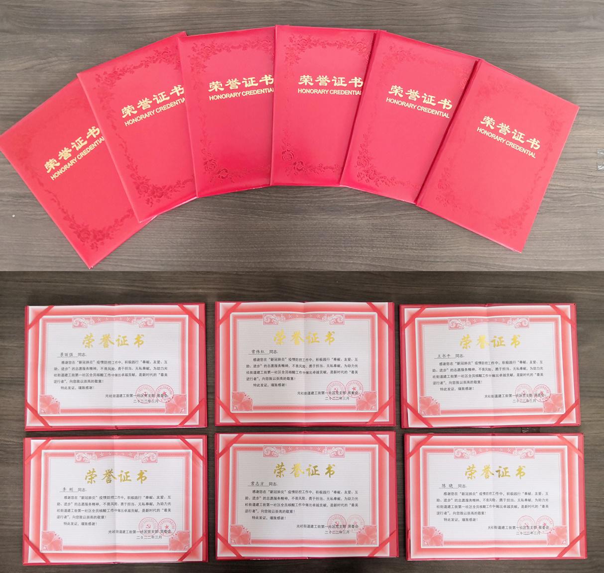 經(jīng)過幾天的艱苦奮斗,尖草坪區(qū)疫情得到有效控制,光社街道建工街第一社區(qū)對(duì)公司支持抗擊疫情工作給予充分肯定,并為志愿者頒發(fā)了榮譽(yù)證書。