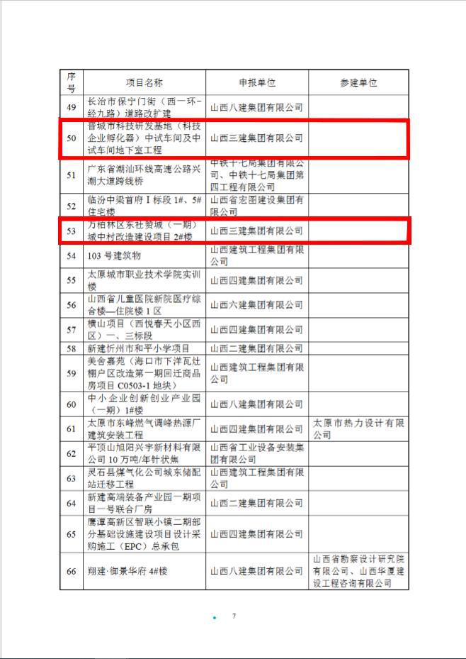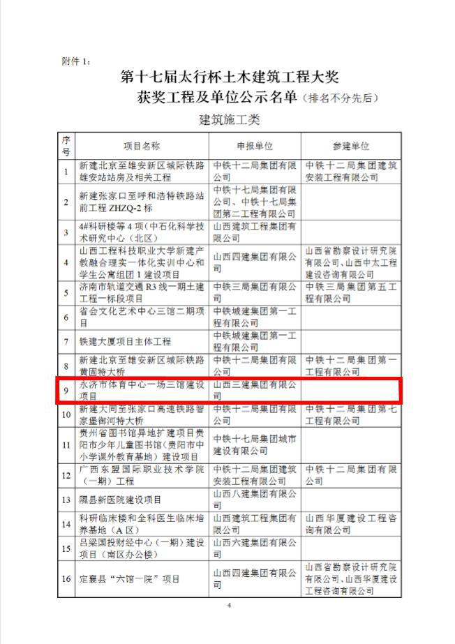 近日,從山西省土木建筑學(xué)會傳來喜訊,公司承建的永濟市體育中心一場三館建設(shè)項目、朔州市科學(xué)技術(shù)館、晉城市科技研發(fā)基地(科技企業(yè)孵化器)中試車間及中試車間地下室工程、萬柏林區(qū)東社贊城城中村改造建設(shè)項目(一期)2#樓等四項工程榮獲第十七屆“太行杯”土木建筑工程大獎。
