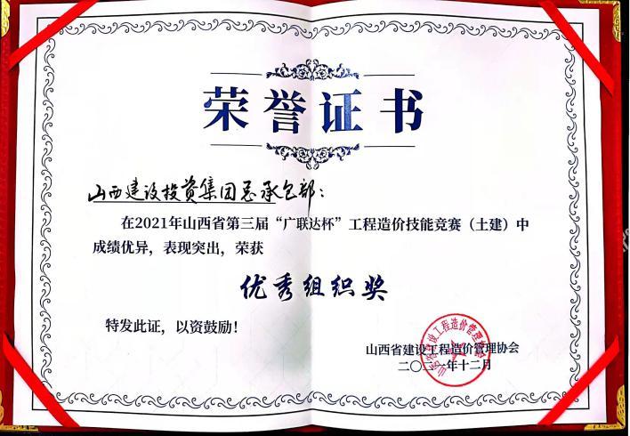 12月18日,由山西省建設(shè)工程造價(jià)管理協(xié)會(huì)主辦的2021年山西省第三屆“廣聯(lián)達(dá)杯”工程造價(jià)技能競(jìng)賽決賽在山西飯店舉行。公司榮獲安裝專業(yè)組“團(tuán)體一等獎(jiǎng)”和“團(tuán)體優(yōu)秀組織獎(jiǎng)”兩項(xiàng)榮譽(yù)。