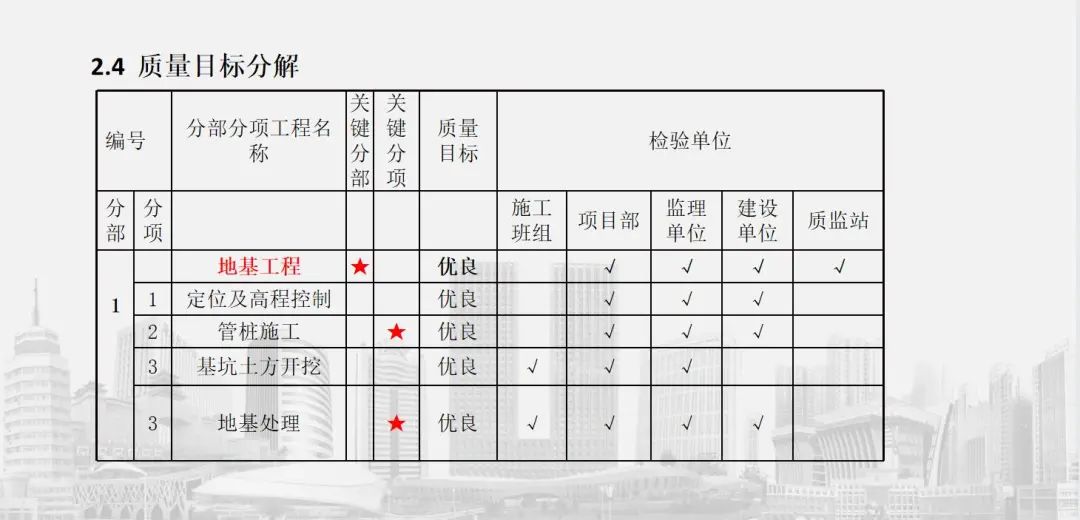 質(zhì)量是工程建設(shè)的生命線,是施工過程中的重中之重。項(xiàng)目在前期進(jìn)行了創(chuàng)優(yōu)策劃,根據(jù)企業(yè)質(zhì)量方針和項(xiàng)目目標(biāo),從“人”“機(jī)”“料”“法”“環(huán)”等各方面進(jìn)行深層次剖析,對(duì)質(zhì)量目標(biāo)進(jìn)行詳細(xì)分解,建立了完整的質(zhì)量管理體系和質(zhì)量管理制度。針對(duì)現(xiàn)場(chǎng)EPC管理模式下施工圖紙滯后的問題,項(xiàng)目部成立創(chuàng)優(yōu)小組,實(shí)行分階段創(chuàng)優(yōu)策劃,同時(shí)總結(jié)工程質(zhì)量通病及防治措施,并適時(shí)評(píng)審、補(bǔ)充和完善;對(duì)施工過程中的重難點(diǎn)工程,各個(gè)擊破,實(shí)現(xiàn)工程質(zhì)量的穩(wěn)步提升。