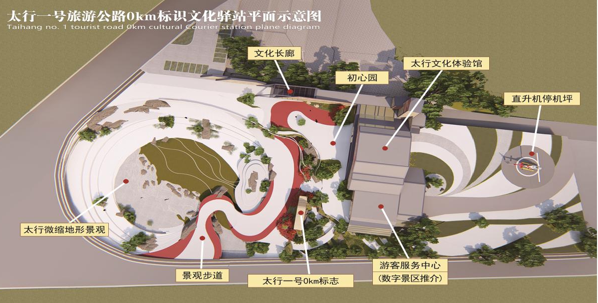 太行一號(hào)旅游公路“0km”標(biāo)志文化驛站項(xiàng)目占地面積20畝,建設(shè)內(nèi)容包括“0km”標(biāo)志、游客中心、太行文化體驗(yàn)館、文化長(zhǎng)廊等。