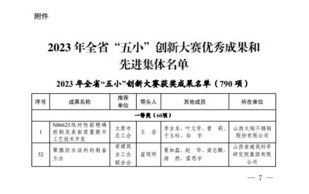 近日,由山西省總工會(huì)、共青團(tuán)山西省委、山西省科學(xué)技術(shù)協(xié)會(huì)組織評(píng)選的山西省2023年“五小”創(chuàng)新大賽獲獎(jiǎng)名單揭曉,山西建投建科院公司申報(bào)的《聚脲防水涂料的制備方法》憑借獨(dú)特的創(chuàng)新思維,在眾多參賽作品中脫穎而出,榮獲一等獎(jiǎng)。
