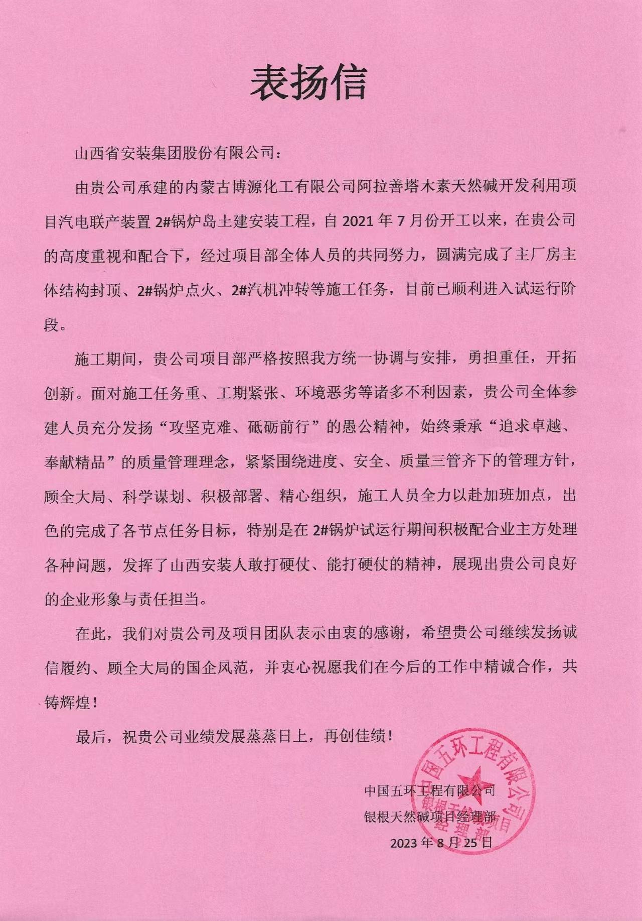 客戶對項目部高效履約進行通報表揚。信中對項目工程進度、施工質(zhì)量給予高度肯定,對施工過程的專業(yè)化管理水平給予高度贊揚。面對施工任務重、工期緊張、環(huán)境惡劣等諸多不利因素,項目部始終秉承“追求卓越、奉獻精品”的質(zhì)量管理理念,緊緊圍繞進度、安全、質(zhì)量三管齊下的管理方針,顧全大局、科學謀劃、積極部署,有效保障2#鍋爐成功點火,展現(xiàn)了良好的企業(yè)形象與責任擔當。