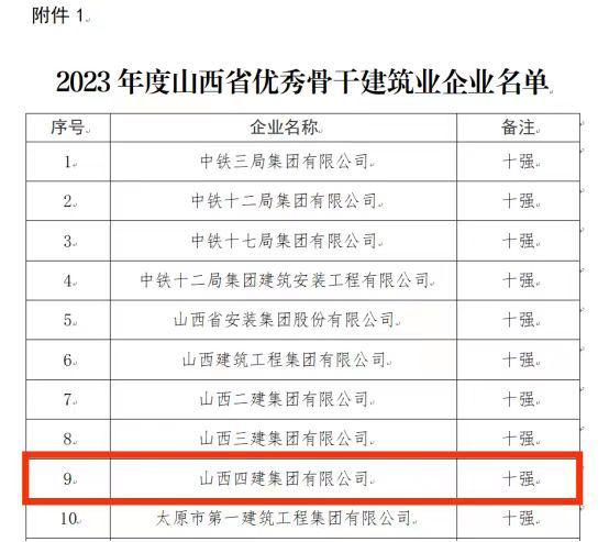 近日,山西省住房和城鄉(xiāng)建設(shè)廳公布《關(guān)于認(rèn)定2023年度山西省骨干建筑業(yè)企業(yè)的決定》,山西建投四建集團(tuán)被認(rèn)定為“2023年度山西省十強(qiáng)優(yōu)秀骨干建筑業(yè)企業(yè)”。