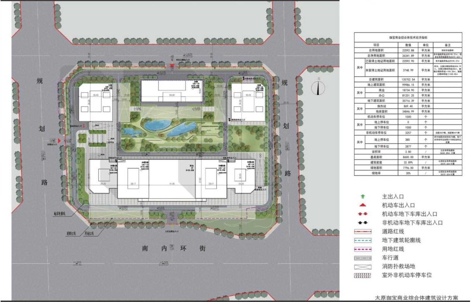 太原珈寶廣場商業(yè)綜合體工程項(xiàng)目位于太原市迎澤區(qū),南內(nèi)環(huán)街東延與馬莊路交匯西北側(cè)。項(xiàng)目總用地面積22592.88平方米,總建筑面積135702.54平方米,用途涉及商業(yè)和辦公,規(guī)劃機(jī)動(dòng)車停車位1000個(gè),容積率3.80,建筑密度32.89%,綠地率30%。