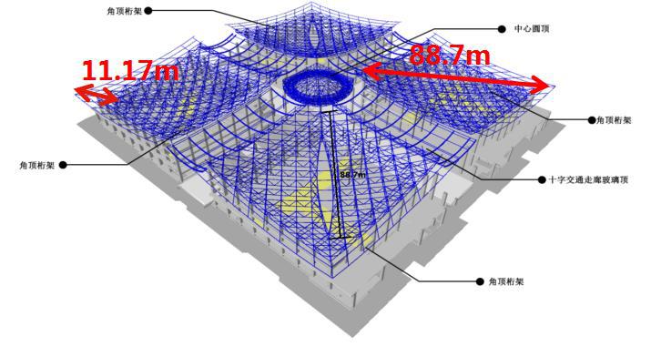 項(xiàng)目總體工程量大、施工面積大、高空作業(yè)量較大,桁架拼裝施工階段工期緊張、施工周期短,鋼結(jié)構(gòu)工程施工工藝復(fù)雜,施工過程中與土建專業(yè)、圍護(hù)結(jié)構(gòu)施工交叉作業(yè)較為頻繁。屋蓋結(jié)構(gòu)是該項(xiàng)目最為復(fù)雜部分,屬于非連續(xù)的大跨度正交斜放空間管桁架結(jié)構(gòu),分四個(gè)角頂、十字交通走廊玻璃頂、中心圓頂三部分,四個(gè)角頂每個(gè)投影面積約6400平方米,重量1000余噸,最大跨度88.7米,最大高空作業(yè)高度約36米,為典型的超高大跨度施工。桁架結(jié)構(gòu)中,各個(gè)角頂均為非對稱桁架、四邊不等高造型,桿件數(shù)量多達(dá)2萬根,其中單個(gè)節(jié)點(diǎn)最多需將14根桿件交匯焊接,制作、施工難度系數(shù)高。