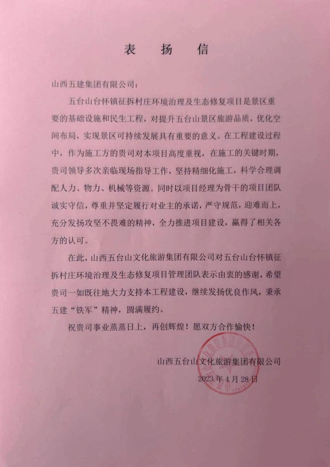 五臺(tái)山臺(tái)懷鎮(zhèn)征拆村莊環(huán)境治理及生態(tài)修復(fù)項(xiàng)目收到來(lái)自山西五臺(tái)山文化旅游集團(tuán)有限公司的感謝信