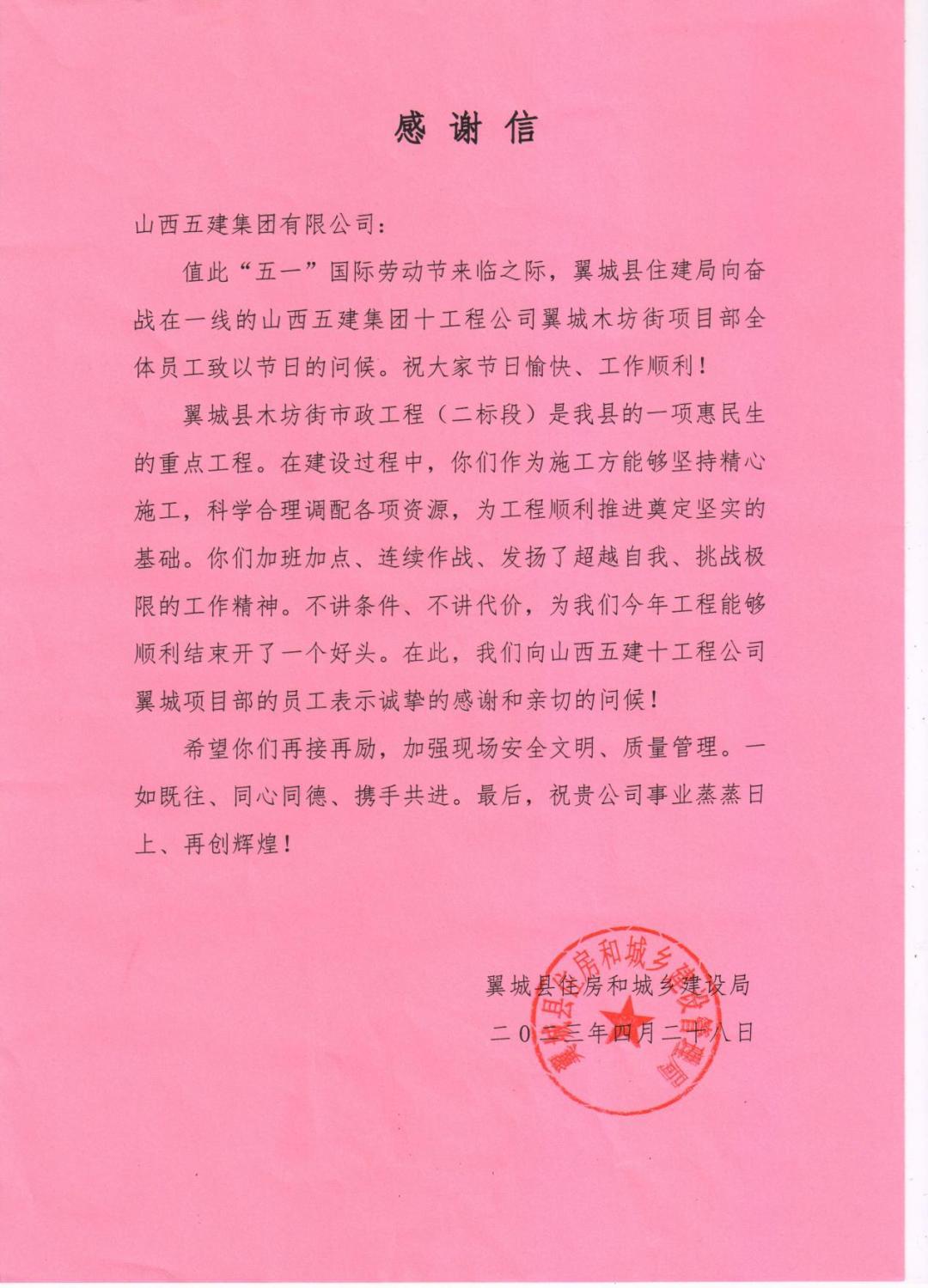翼城縣木坊街市政工程(二標(biāo)段)項(xiàng)目收到來(lái)自翼城縣住房和城鄉(xiāng)建設(shè)局的感謝信