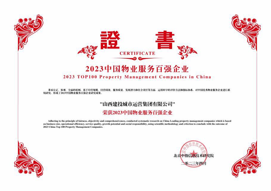 2023中國物業(yè)服務(wù)百強企業(yè)證書