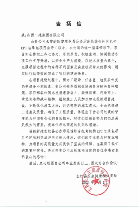 新建左權(quán)縣公辦示范性綜合托育機(jī)構(gòu)EPC總承包項(xiàng)目收到縣委縣政府左權(quán)縣衛(wèi)生健康和體育局發(fā)來(lái)的表?yè)P(yáng)信。信中指出,二建集團(tuán)高度重視、統(tǒng)一協(xié)調(diào)、齊抓共管,項(xiàng)目團(tuán)隊(duì)在項(xiàng)目建設(shè)過(guò)程中秉承“精心精品、專心專注”的建筑理念,全力以赴奔著既定目標(biāo)奮發(fā)努力,實(shí)現(xiàn)工程總目標(biāo),對(duì)二建集團(tuán)過(guò)硬的管理能力和責(zé)任擔(dān)當(dāng)表示高度認(rèn)同。