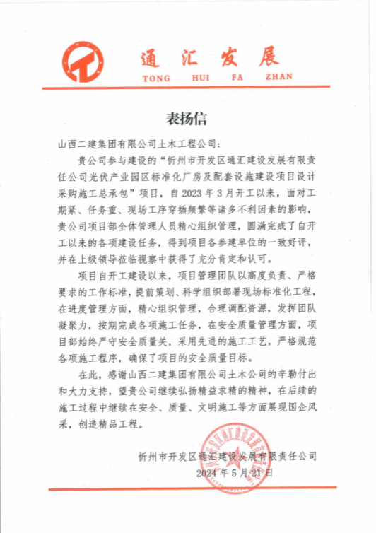光伏產(chǎn)業(yè)園區(qū)標(biāo)準(zhǔn)化廠房及配套設(shè)施建設(shè)項(xiàng)目收到建設(shè)單位表?yè)P(yáng)信。作為忻州地區(qū)的重點(diǎn)建設(shè)工程,該項(xiàng)目是加快推動(dòng)忻州市開(kāi)發(fā)區(qū)全方位高質(zhì)量發(fā)展的標(biāo)桿項(xiàng)目。開(kāi)工以來(lái),項(xiàng)目部高質(zhì)量、高標(biāo)準(zhǔn)、按時(shí)完成工程建設(shè)任務(wù),以實(shí)際行動(dòng)踐行“崇尚信譽(yù)、精求質(zhì)量、強(qiáng)健素質(zhì)、至誠(chéng)服務(wù)”,獲得了建設(shè)單位的嘉獎(jiǎng)及認(rèn)可。