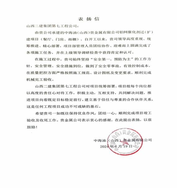 鉑網(wǎng)催化劑遷(擴(kuò))建項(xiàng)目收到建設(shè)單位中海油(山西)貴金屬有限公司發(fā)來(lái)的表?yè)P(yáng)信。信中對(duì)分公司、項(xiàng)目部面對(duì)施工圖紙變更大、交叉作業(yè)多、改建與新建結(jié)合、施工繁瑣等不利因素,統(tǒng)籌部署,高效完成建設(shè)施工任務(wù)給予肯定。