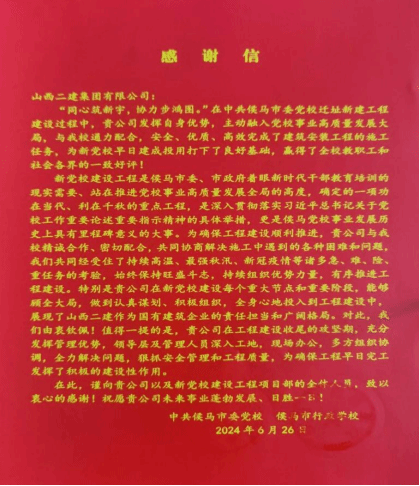 臨汾公司承建的中國(guó)共產(chǎn)黨侯馬市委黨校遷址新建工程項(xiàng)目收到建設(shè)單位侯馬市委黨校及侯馬市行政學(xué)校的感謝信。信中對(duì)項(xiàng)目的工程進(jìn)度、施工質(zhì)量表示充分肯定,對(duì)二建集團(tuán)所展示出的國(guó)企擔(dān)當(dāng)表示高度贊揚(yáng)。