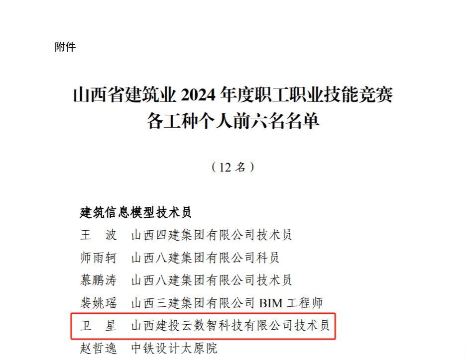 由山西省總工會(huì)、山西省人社廳、山西省住建廳聯(lián)合舉辦的山西省建筑信息模型(BIM)技術(shù)員技能競(jìng)賽于8月在太原舉行。山西建投云數(shù)智公司選手衛(wèi)星在競(jìng)賽中脫穎而出,榮獲第五名。