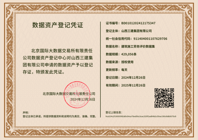 12月26日,山西建投三建集團在北京國際大數據交易所成功完成“建筑施工勞務評價數據集”數據資產登記,并成功實現數據資產入表,成為全國首例建筑施工勞務數據入表企業(yè)。