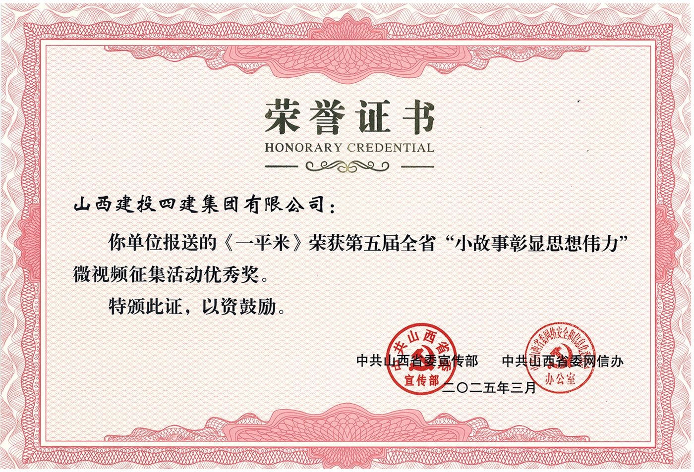 3月17日,在第五屆全省理論宣講大賽暨“小故事彰顯思想偉力”微視頻優(yōu)秀作品展演頒獎(jiǎng)活動(dòng)中,山西建投四建集團(tuán)選送的短視頻作品《一平米》榮獲征集活動(dòng)優(yōu)秀獎(jiǎng)。