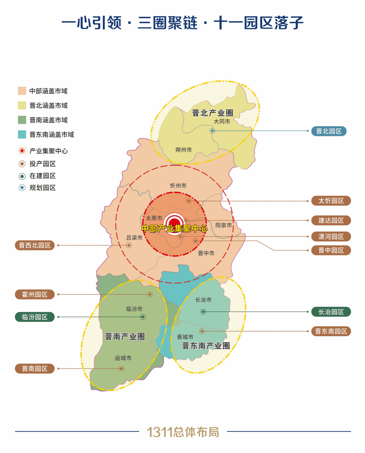“十四五”時期,山西省提出了“全方位推動高質(zhì)量發(fā)展、奮力走在中部崛起前列”的奮斗目標,為順應新時代發(fā)展趨勢,搶抓高質(zhì)量發(fā)展機遇,2022年,山西建投科學調(diào)整戰(zhàn)略布局,確定了“八業(yè)兩基三臺”戰(zhàn)略規(guī)劃和“一心三圈十一園區(qū)”總體布局。